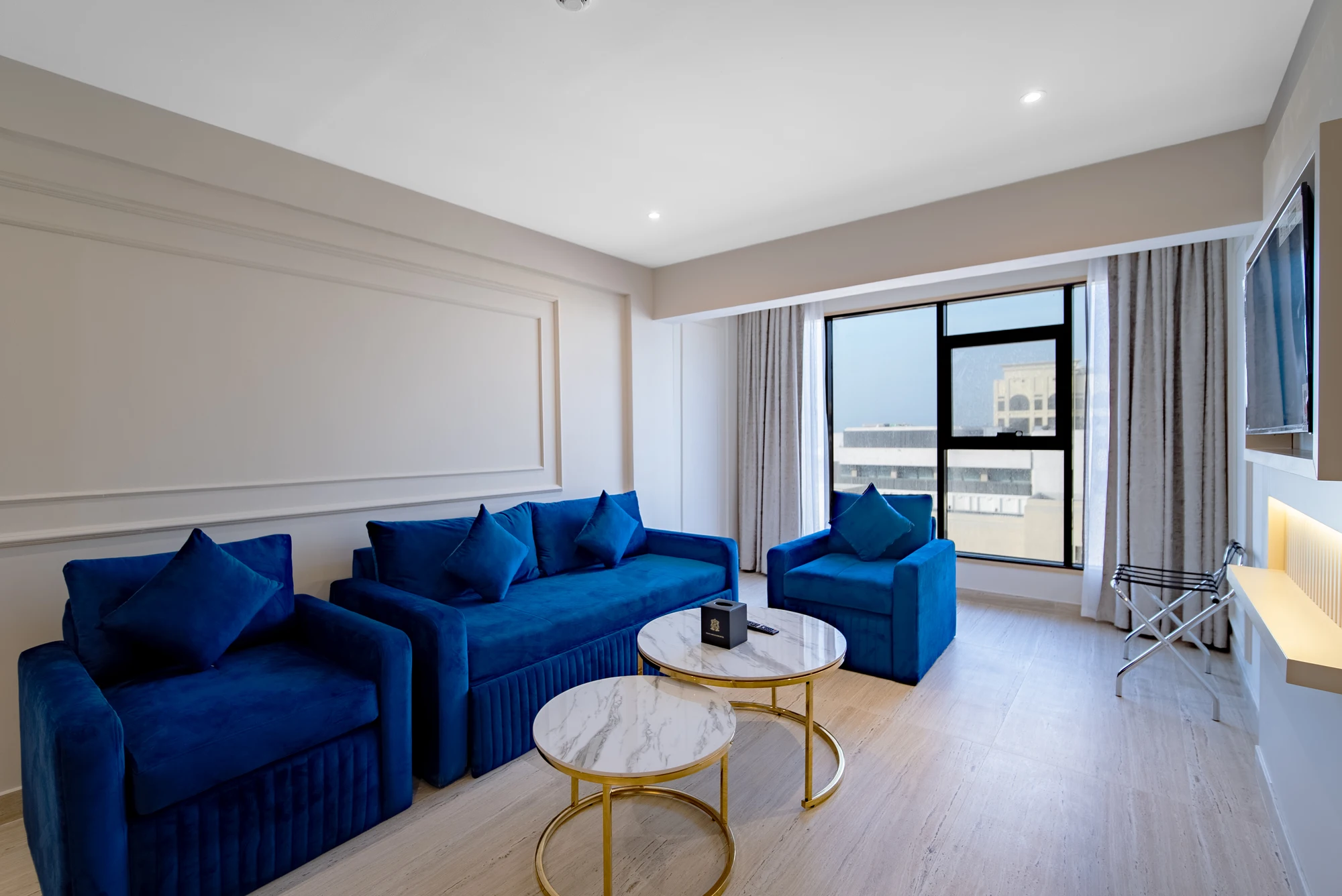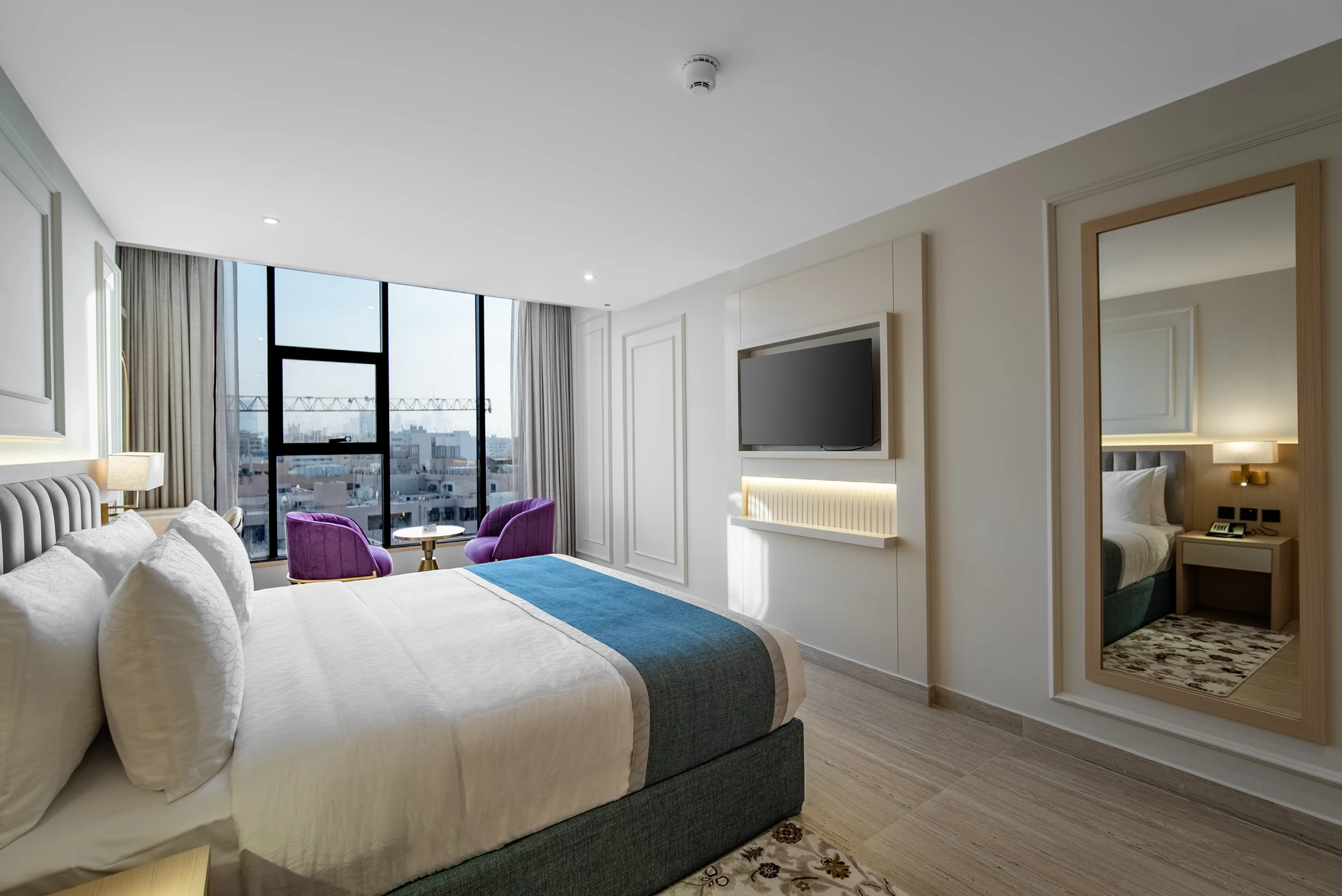 Spacious and sophisticated, this suite includes a separate living area with a sofa, coffee table, and dining nook. The bedroom boasts a King bed with a premium mattress, while the marble bathroom features a walk-in shower and designer toiletries. Ideal for extended stays, with a kitchenette and panoramic city views.